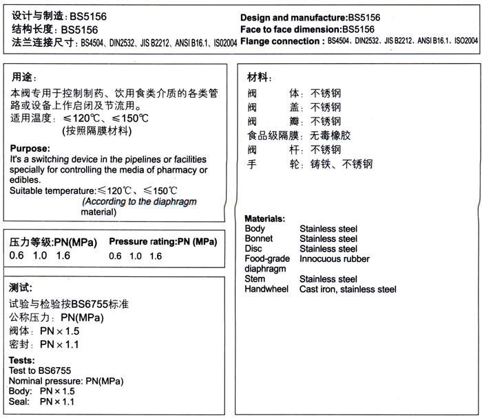 2、若已經(jīng)由設(shè)計單位選定我公司的衛(wèi)生級隔膜閥產(chǎn)品型號,請按型號直接向我司訂購;
